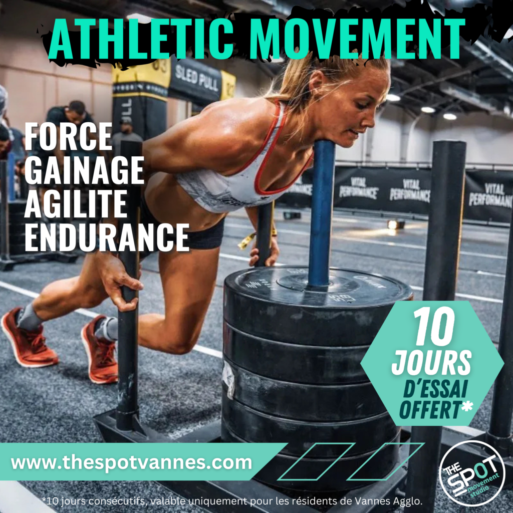 DEVELOPPEZ VOTRE FORCE, VOTRE ENDURANCE ET VOTRE AGILITE! Le cours d’ATHLETIC MOVEMENT est un cours de FUNCTIONAL TRAINING (Préparation Physique Généralisée) contenant des éléments de Callisthénie (exercices au poids de corps), d’Aérobie, de Force Athlétique, de Gymnastique au sol et suspendue (aux anneaux et barres), et de Pliométrie.
